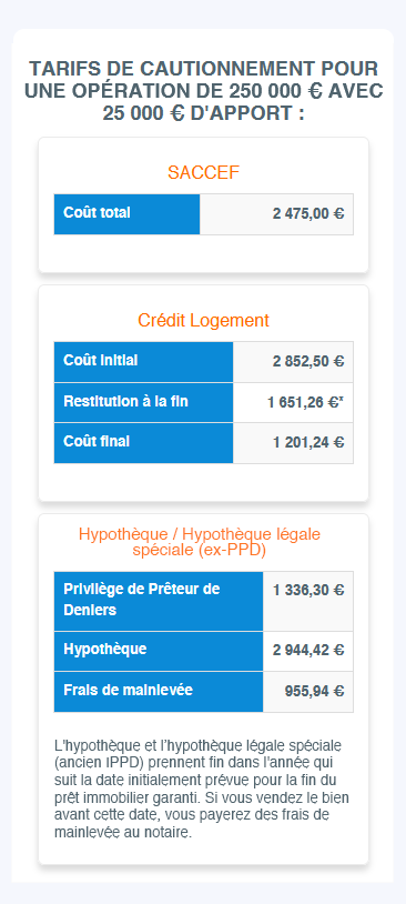 Avec notre calculette, comparez le coût des garanties SACCEF, Crédit Logement et hypothèque/hypotèque légale spéciale (ancien privilège de prêteur de deniers) pour votre projet d’acquisition.